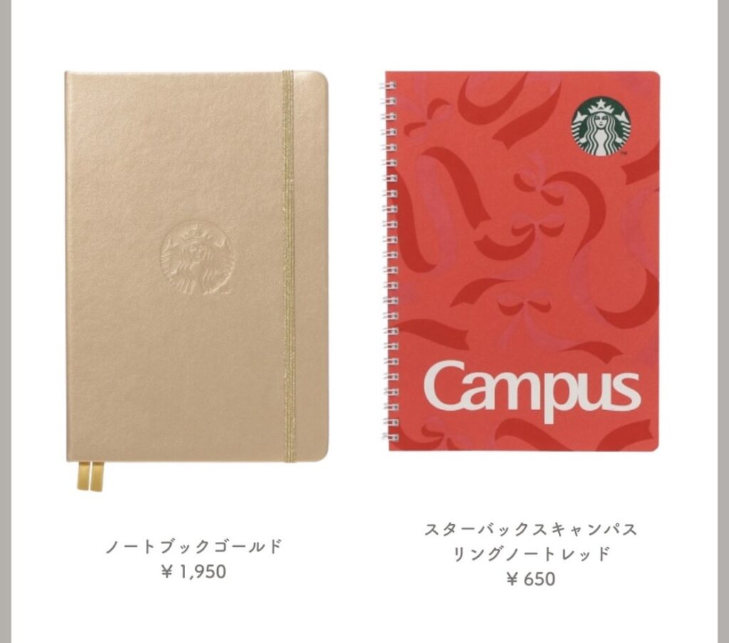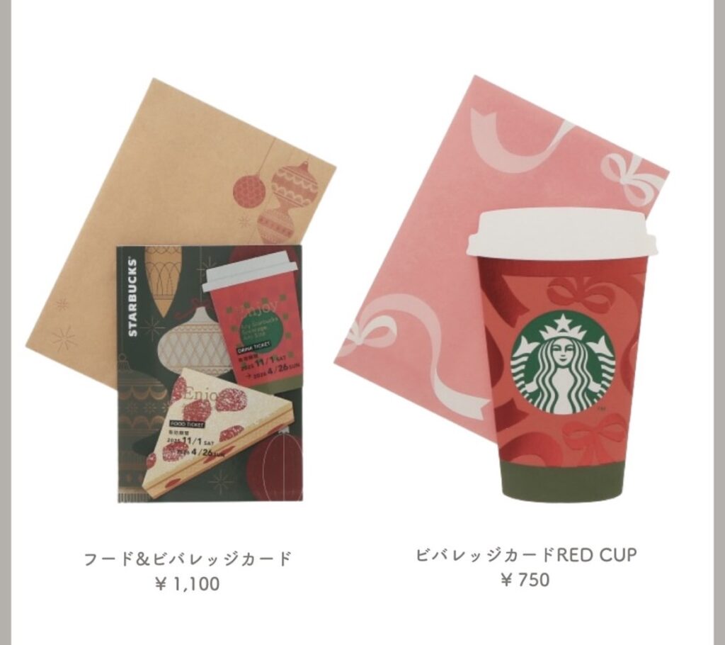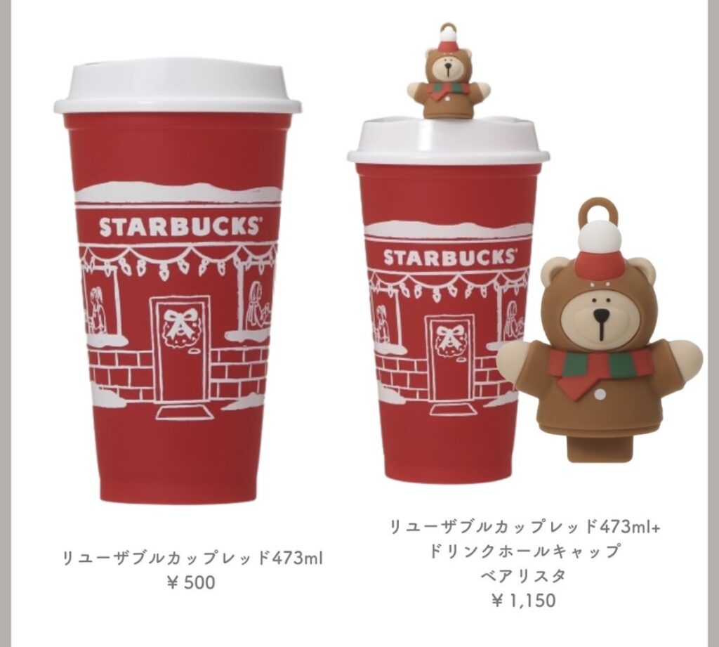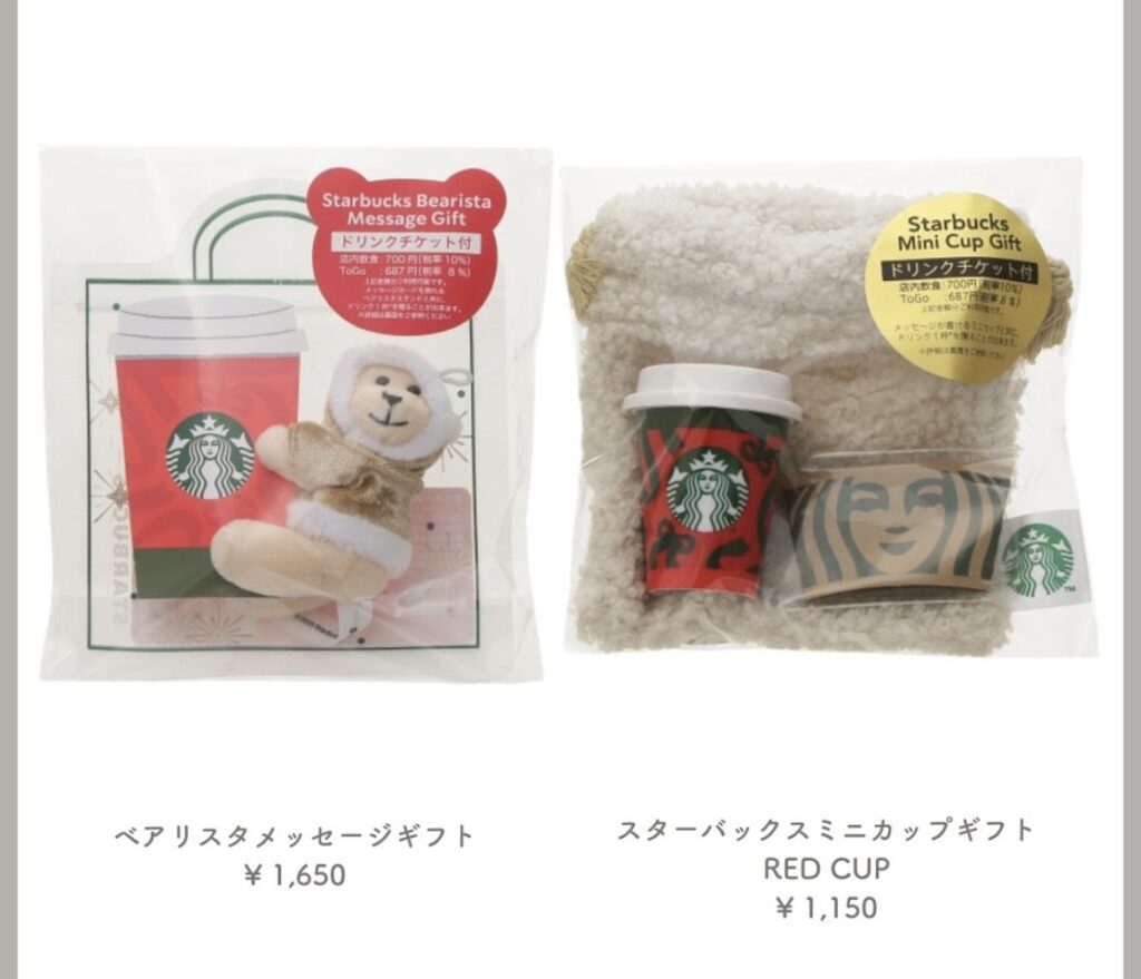 グッズやドリンクカップにも、雪の結晶やツリー、リボンなどのモチーフが多く登場しています。