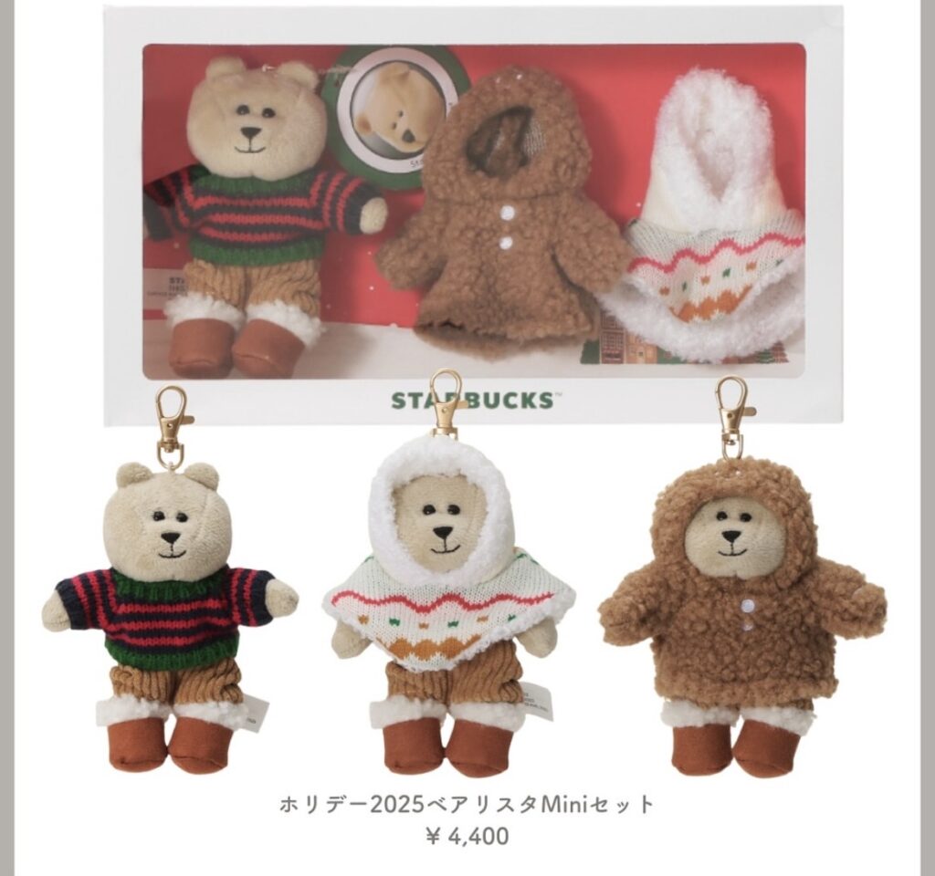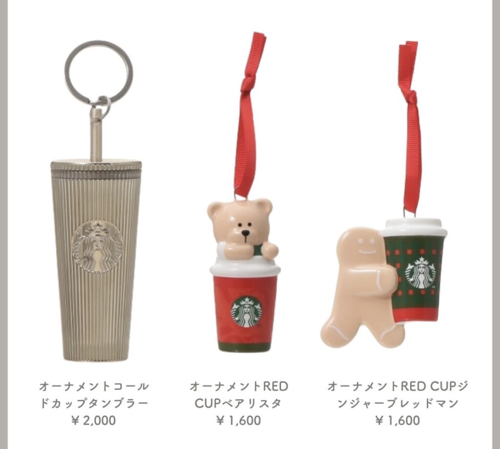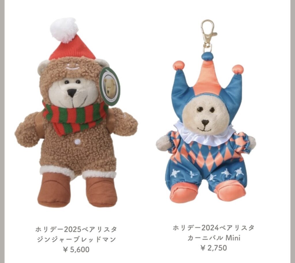 スタバのロゴが入ったベアリスタ(くまのぬいぐるみ)や、限定タンブラー・オーナメントなど、思わず手に取りたくなるかわいさです。
